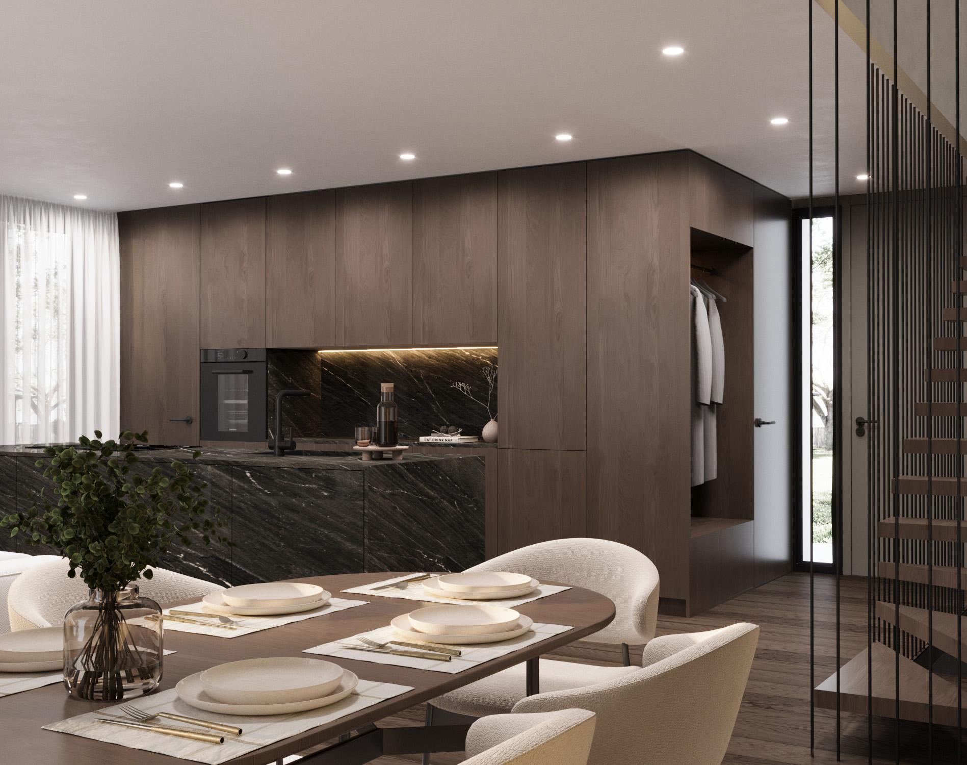 Die Architektur präsentiert sich klar, zeitlos und hochwertig. Grosszügige Wohnräume, lichtdurchflutete Fensterfronten und elegante Materialisierungen verleihen jedem Haus eine besondere, warme Exklusivität.